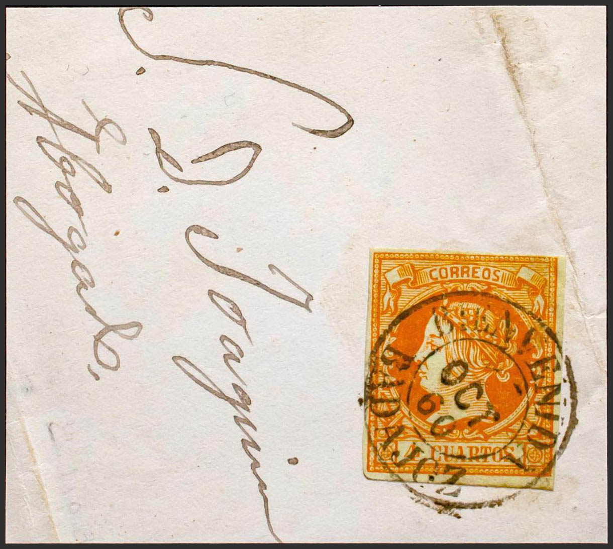 △ 52. 1860. 4 cuartos naranja, sobre fragmento. Matasello BIENVENIDA / BADAJOZ (Tipo I). MAGNIFICO.