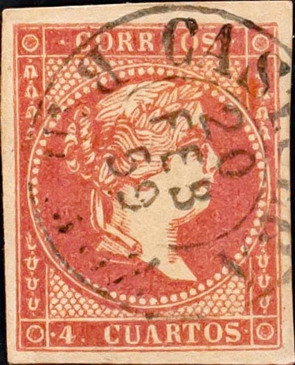 48. 1855. 4 cuartos rojo. Matasello CASTUERA / BADAJOZ (Tipo I). MAGNIFICO.