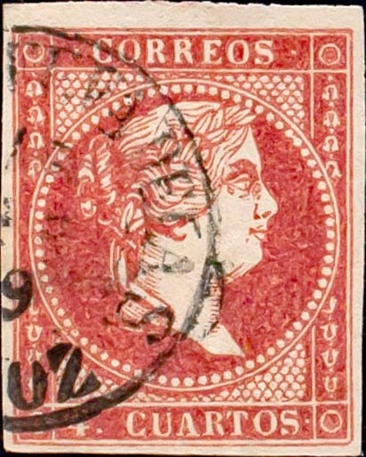 48. 1855. 4 cuartos rojo. Matasello VILLANUEVA DE LA S. / BADAJOZ (Tipo I). MAGNIFICO.