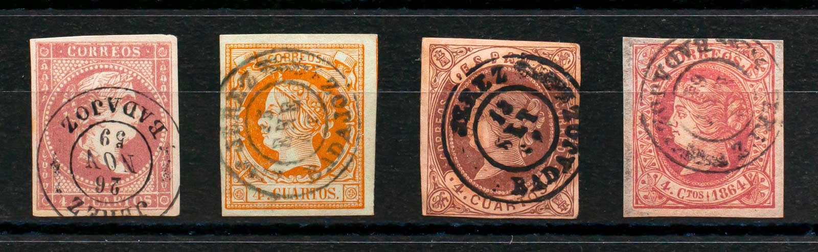 48, 52, 58, 64. (1855ca). Conjunto de cuatro sellos del 4 cuartos rojo, amarillo, castaño y rosa, inutilizados con el matasello JEREZ / BADAJOZ. MAGNIFICO.