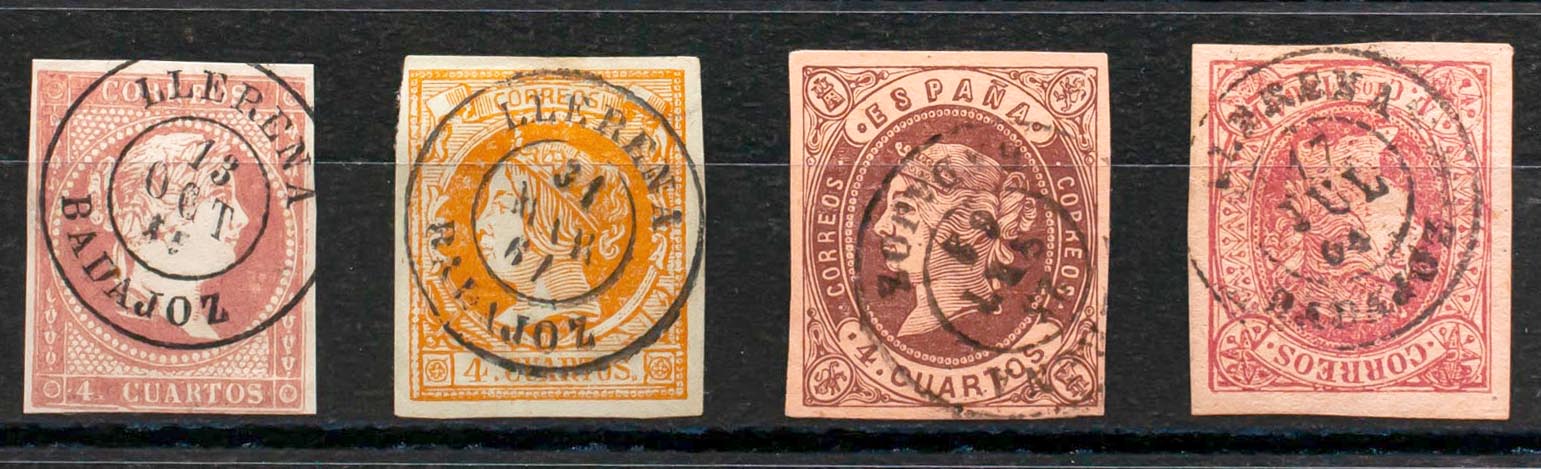 48, 52, 58, 64. (1855ca). Conjunto de cuatro sellos del 4 cuartos rojo, amarillo, castaño y rosa, inutilizados con el matasello LLERENA / BADAJOZ. MAGNIFICO.