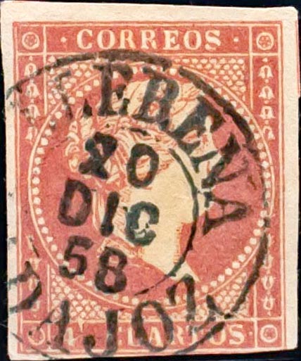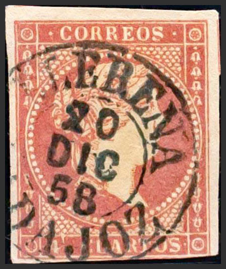 48. 1855. 4 cuartos rojo. Matasello LLERENA / BADAJOZ (Tipo I). MAGNIFICO.