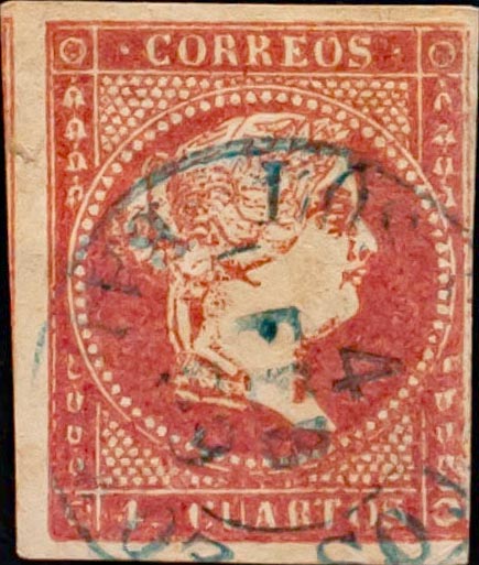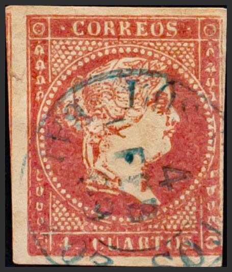 48. 1855. 4 cuartos rojo. Matasello LOS SANTOS / BADAJOZ (Tipo I), en azul. BONITO Y RARO.