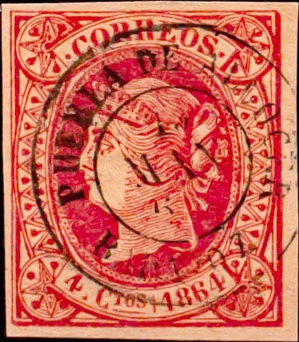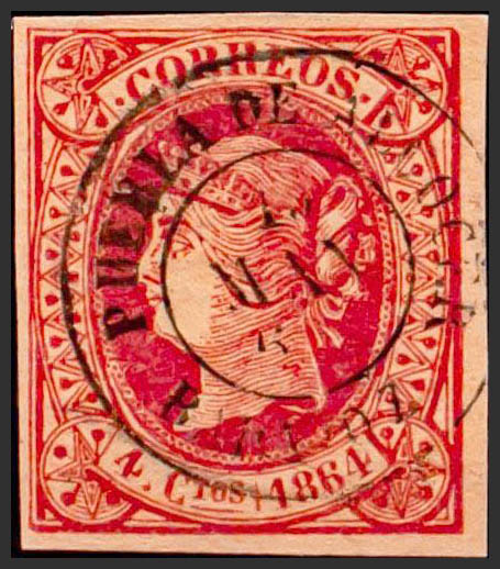 64. 1864. 4 cuartos rosa. Matasello PUEBLA DE ALCOCER / BADAJOZ. MAGNIFICO Y RARO.