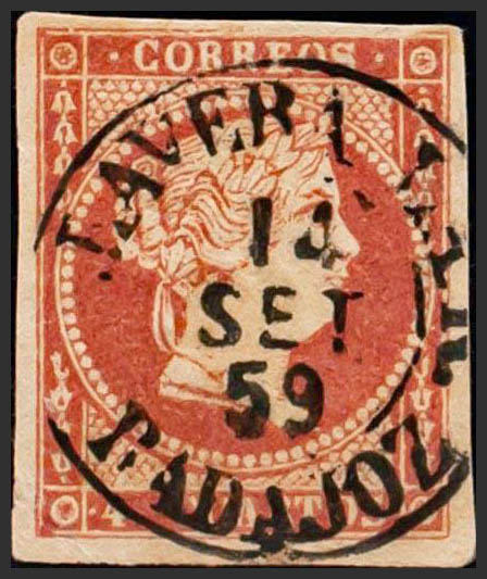 48. 1855. 4 cuartos rojo. Matasello TALAVERA LA R. / BADAJOZ (Tipo I). MAGNIFICO.