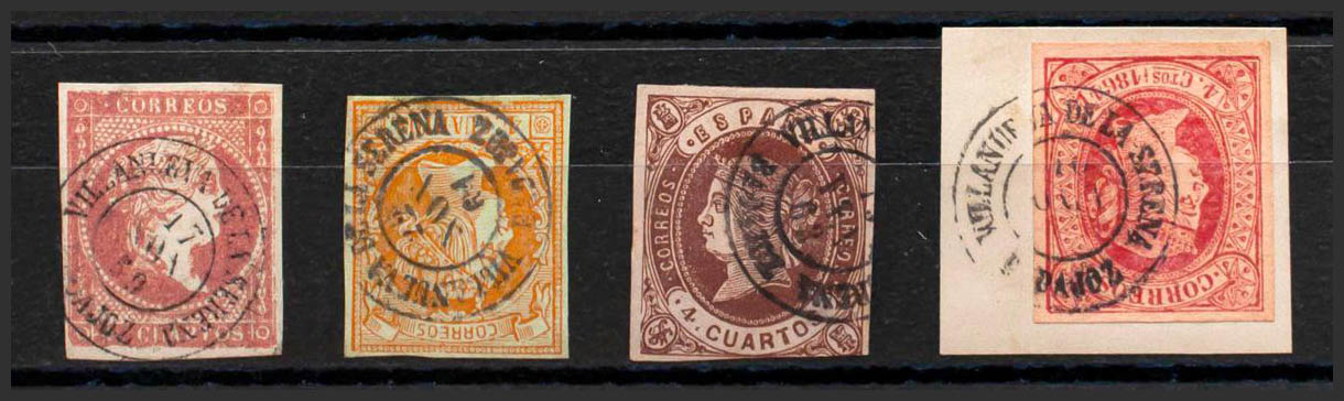 48, 52, 58, 64. (1855ca). Conjunto de cuatro sellos del 4 cuartos rojo, amarillo, castaño y rosa, inutilizados con el matasello VILLANUEVA DE LA SERENA / BADAJOZ. MAGNIFICO.