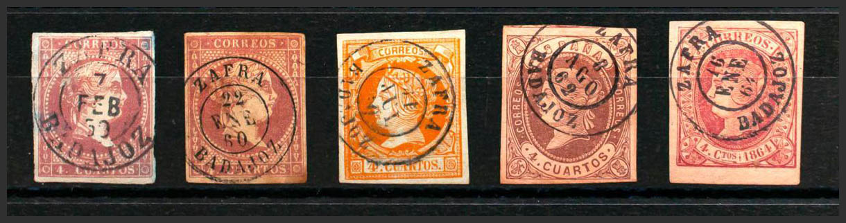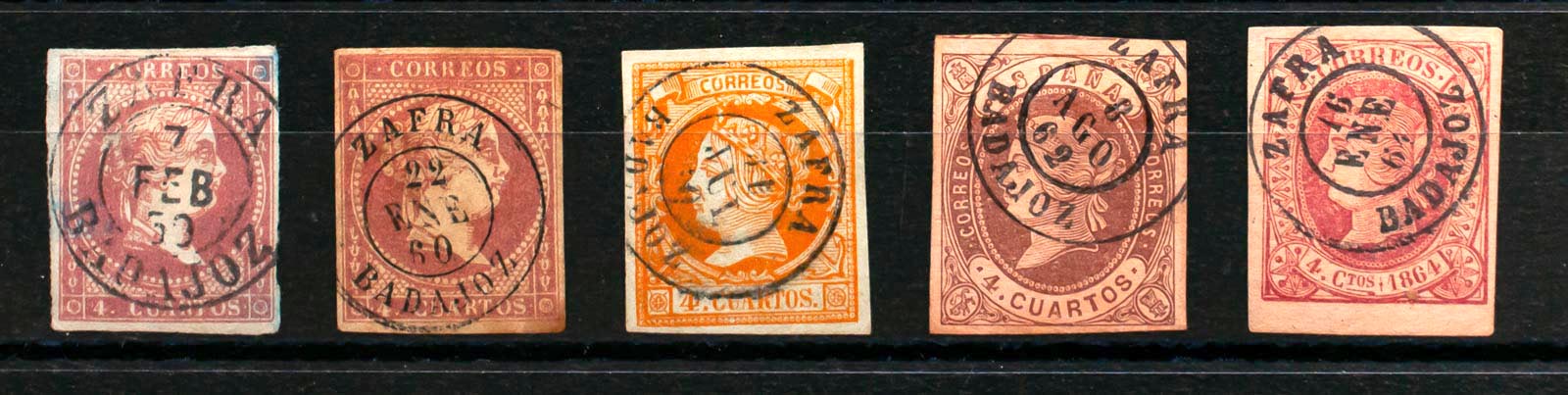 48(2), 52, 58, 64. (1855ca). Conjunto de cinco sellos del 4 cuartos rojo, amarillo, castaño y rosa, inutilizados con el matasello ZAFRA / BADAJOZ (incluyendo el Tipo I sobre el 4 cuartos rojo). MAGNIFICO.