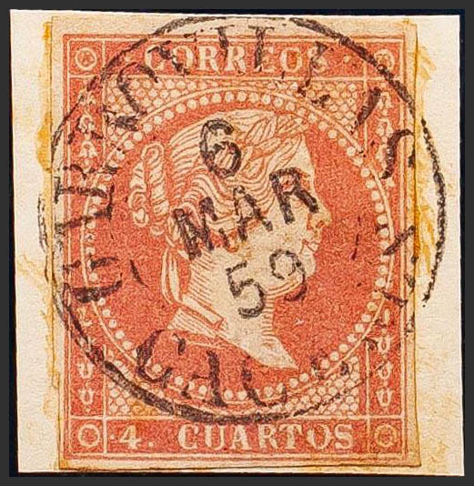 △ 48. 1855. 4 cuartos rojo, sobre fragmento. Matasello GARROVILLAS / CACERES (Tipo I). MAGNIFICO Y MUY RARO.