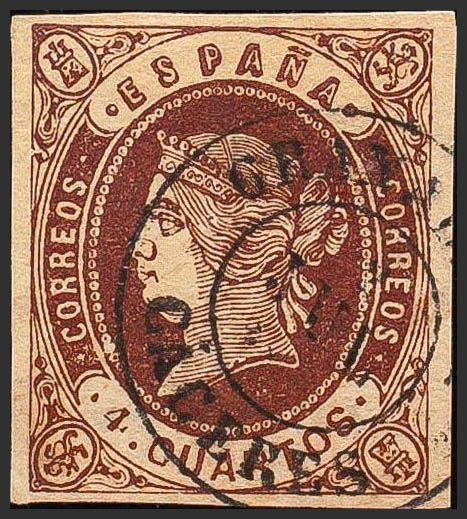 58. 1862. 4 cuartos castaño. Matasello GRANADILLA / CACERES. MAGNIFICO Y RARO.
