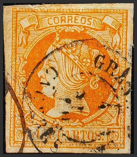52. 1860. 4 cuartos amarillo. Matasello GRANADILLA / CACERES. BONITO Y RARO.