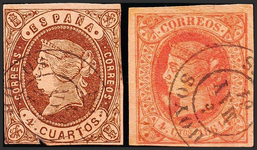 58, 64. (1862ca). Conjunto de dos sellos del 4 cuartos castaño y 4 cuartos rosa, inutilizados con matasello HOYOS / CACERES. MAGNIFICO Y RAROS.