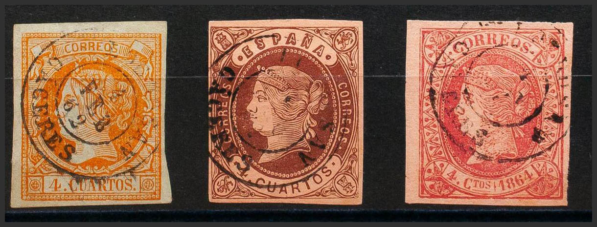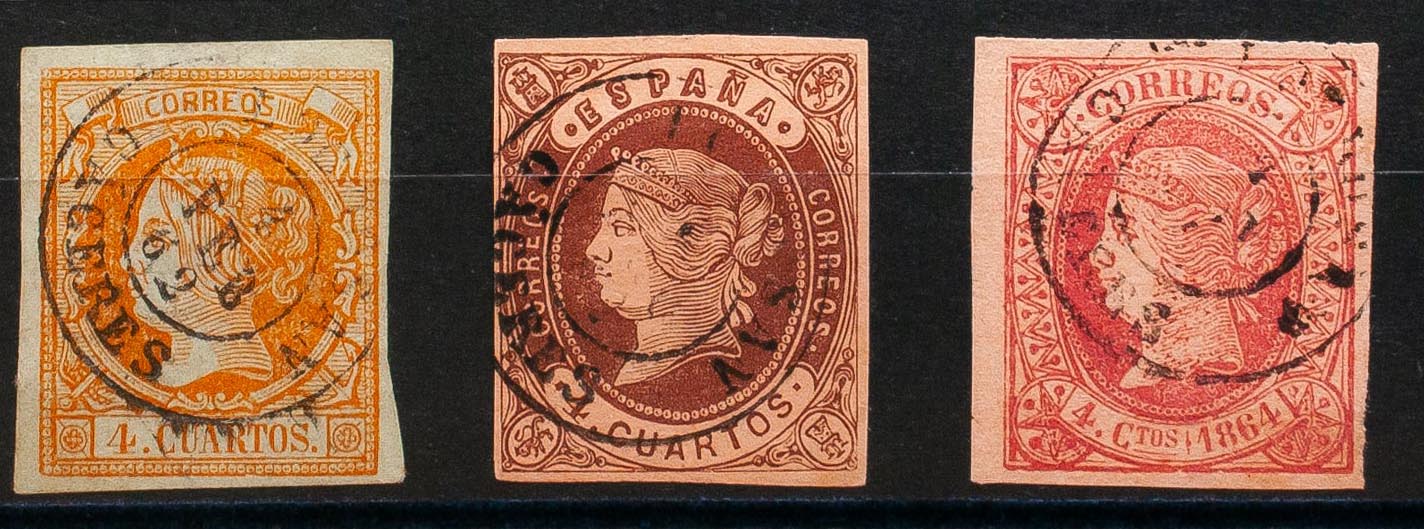 52, 58, 64. (1860ca). Conjunto de tres sellos del 4 cuartos amarillo, castaño y rosa, inutilizados con matasello LOGROSAN / CACERES. MAGNIFICO.