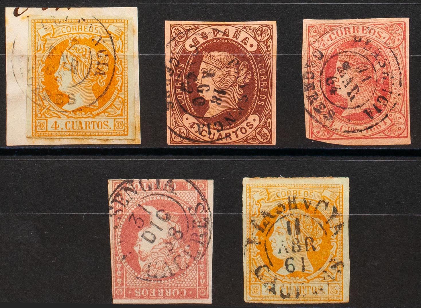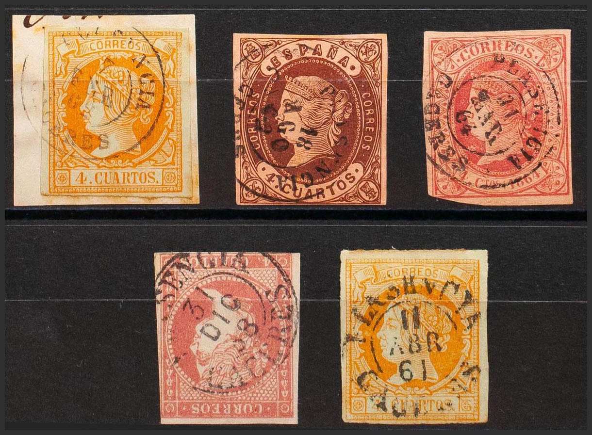 48, 52(2), 58, 64. (1855ca). Conjunto de cinco sellos del 4 cuartos rojo, amarillo, castaño y rosa, inutilizados con el matasello PLASENCIA / CACERES (Tipo I sobre el 4 cuartos rojo e incluyendo el 4 cuartos amarillo también sobre el Tipo I). MAGNIFICO.