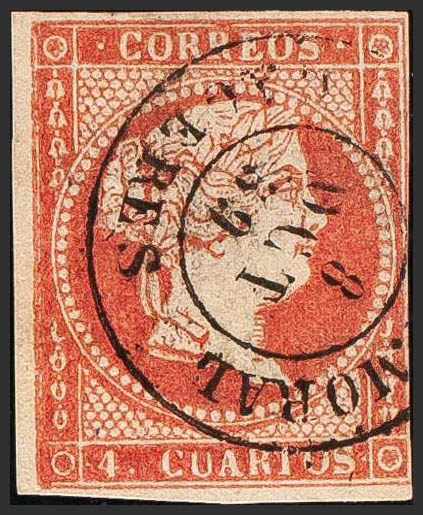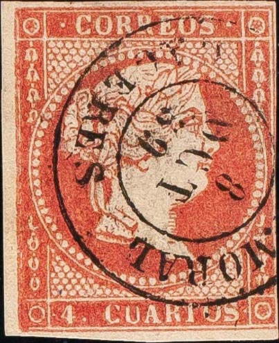 48. 1855. 4 cuartos rojo. Matasello NAVALMORAL / CACERES. MAGNIFICO.