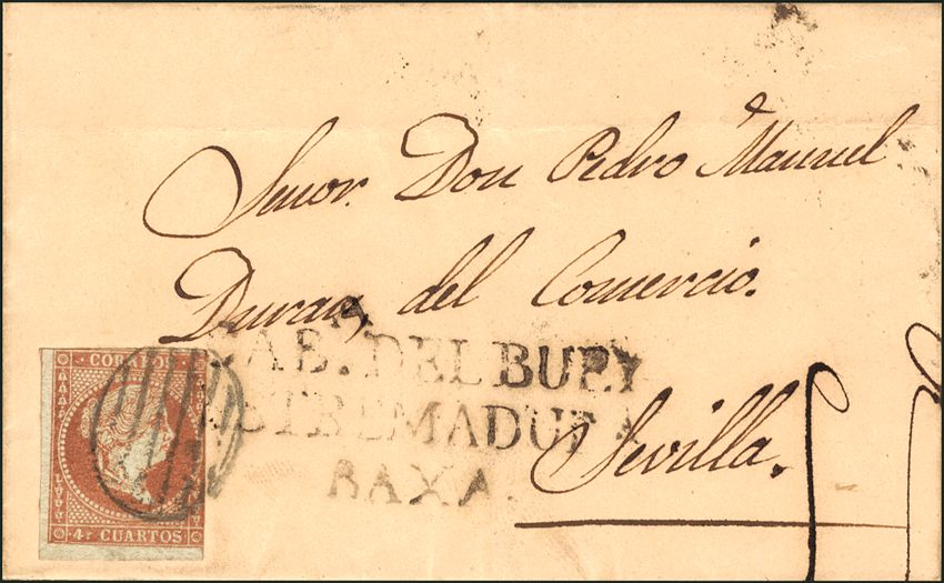 40. 1856. 4 cuartos rojo. CABEZA DEL BUEY a SEVILLA. Matasello PARRILLA azulada y al lado marca CABª DEL BUEY / ESTREMADURA / BAXA. LUJO.