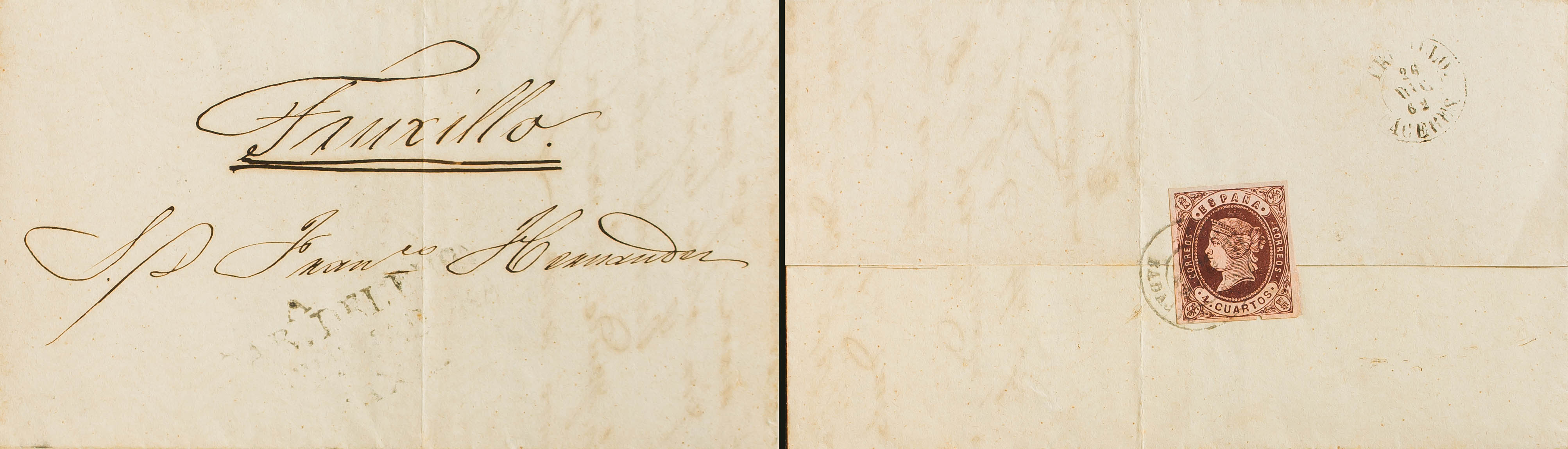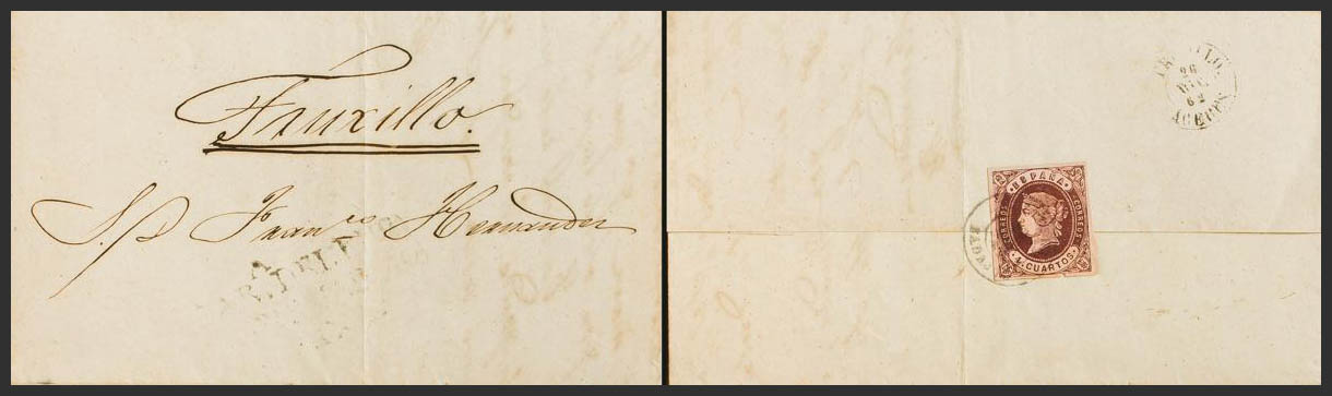 58. 1862. 4 cuartos castaño (actuando de cierre e inutilizado CASTUERA / BADAJOZ). CABEZA DEL BUEY (BADAJOZ) a TRUJILLO. En el frente marca prefilatélica CABª DEL BUEY / ESTREMADURA / BAXA. MAGNIFICA E INUSUAL.