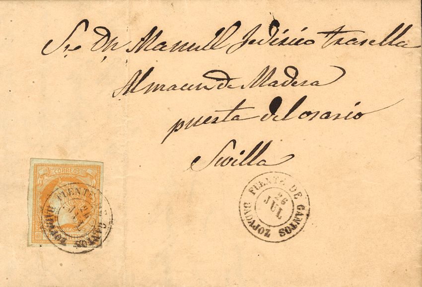 52. 1860. 4 cuartos amarillo. FUENTE DE CANTOS a SEVILLA. Matasello FUENTE DE CANTOS / BADAJOZ. MAGNIFICA.