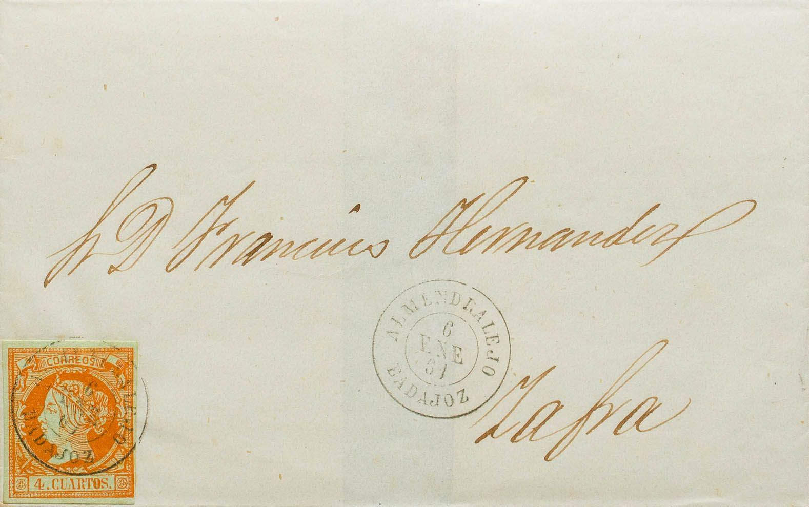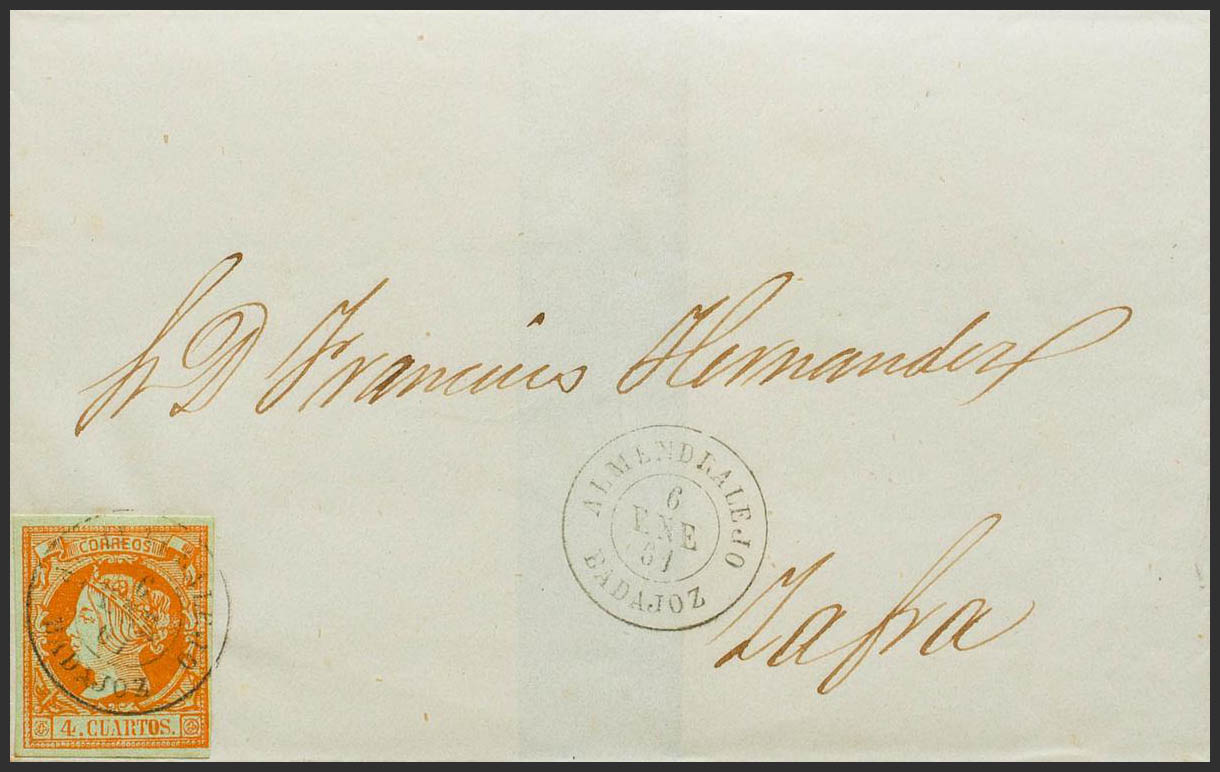52. 1864. 4 cuartos naranja. ALMENDRALEJO a ZAFRA. Matasello ALMENDRALEJO / BADAJOZ. MAGNIFICA.