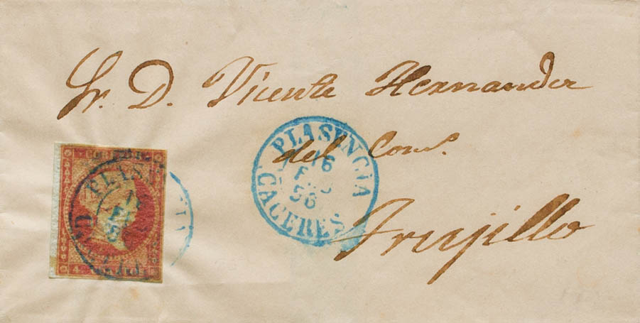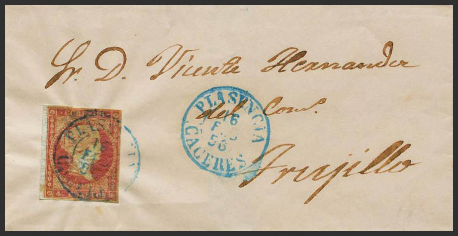 40. 1856. 4 cuartos rojo. PLASENCIA (CACERES) a TRUJILLO. Matasello PLASENCIA / CACERES (Tipo I), en azul. MAGNIFICA Y RARA.