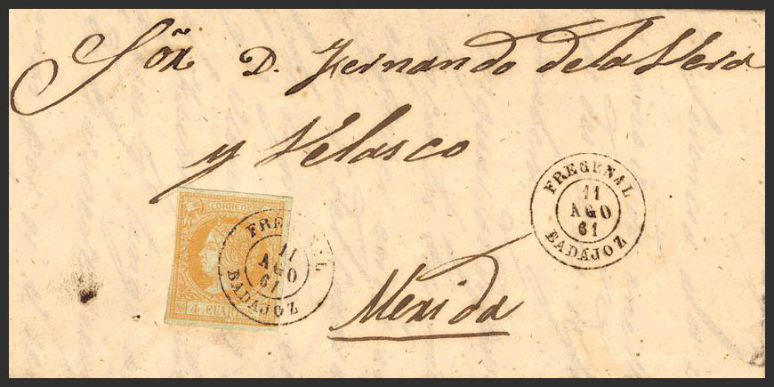 52. 1860. 4 cuartos amarillo. FREGENAL a MERIDA. Matasello FREGENAL / BADAJOZ.