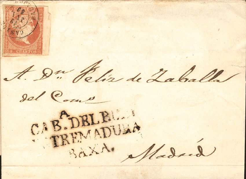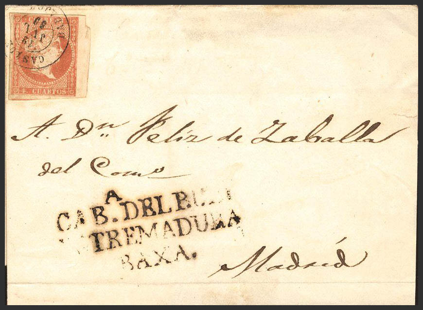 48. 1859. 4 cuartos rojo. CASTUERA a MADRID. Matasello CASTUERA / BADAJOZ, al lado marca prefilatélica CABª DEL BUEY / ESTREMADURA / BAXA. BONITA.