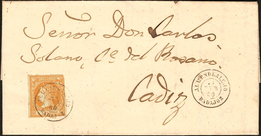 52. 1860. 4 cuartos amarillo. ALMENDRALEJO a CADIZ. Matasello ALMENDRALEJO / BADAJOZ. BONITA.