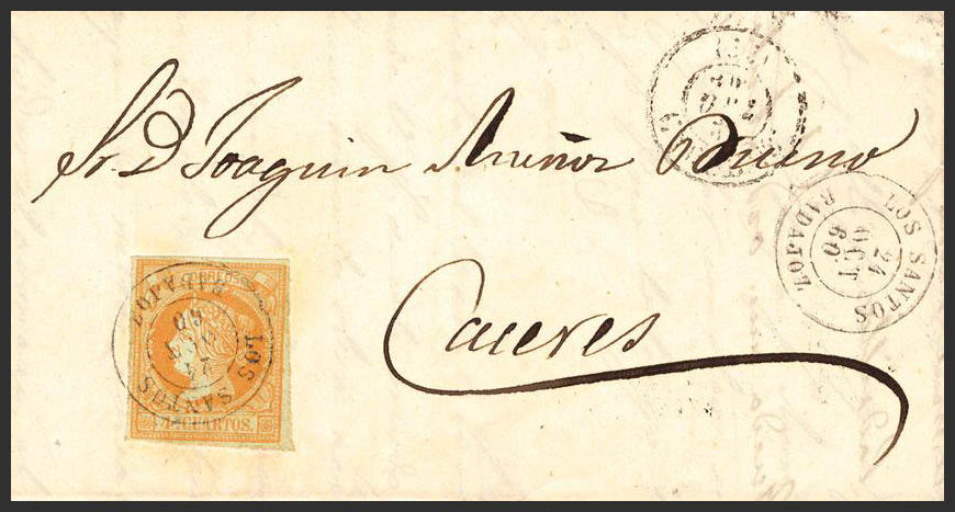52. 1860. 4 cuartos amarillo. LOS SANTOS a CACERES. Matasello LOS SANTOS / BADAJOZ. MAGNIFICA Y RARA.
