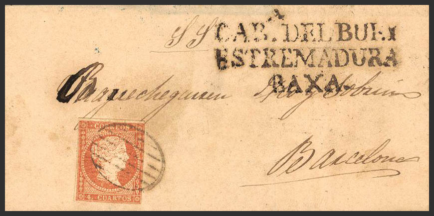 44. (1856ca). 4 cuartos rojo. CABEZA DE BUEY a BARCELONA. Matasello PARRILLA, al lado marca prefilatélica CABª DEL BUEY / ESTREMADURA / BAXA. BONITA.