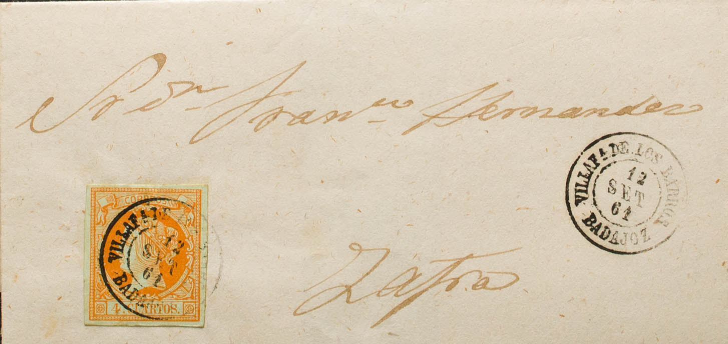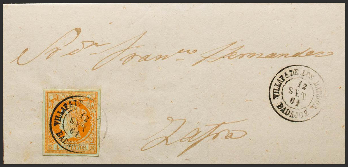52. 1861. 4 cuartos naranja. VILLAFRANCA DE LOS BARROS a ZAFRA. Matasello VILLAFª DE LOS BARROS / BADAJOZ. MAGNIFICA.