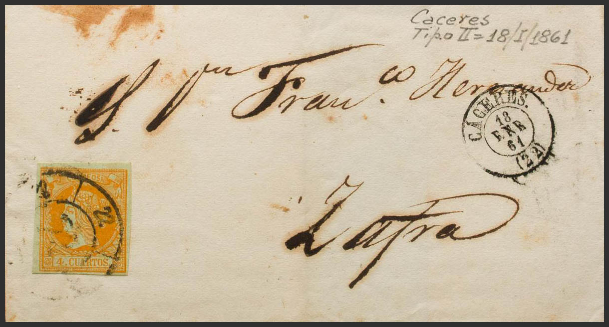 52. 1861. 4 cuartos naranja. CACERES a ZAFRA. Matasello R.CARRETA Nº22. MAGNIFICA.