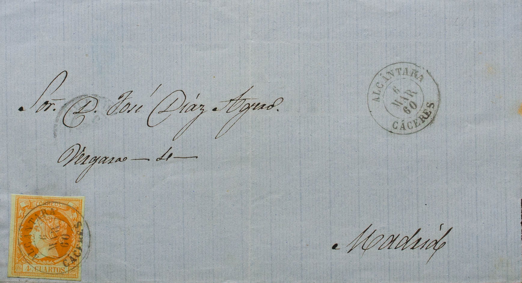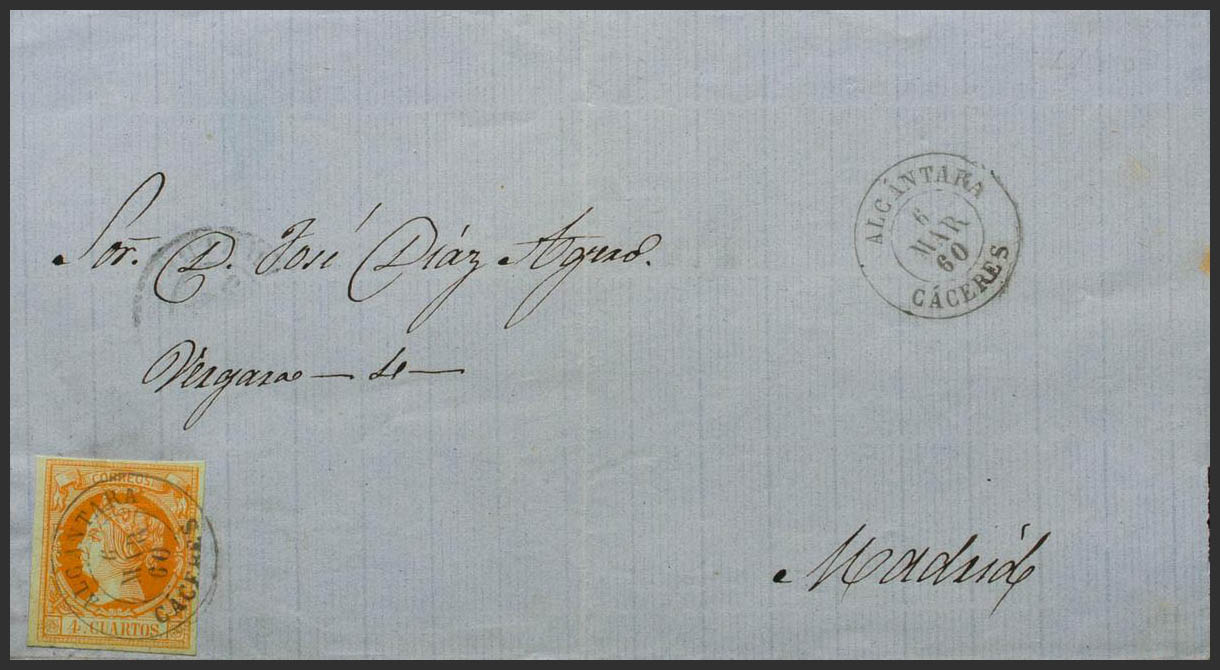 52. 1860. 4 cuartos naranja. ALCANTARA a MADRID. Matasello ALCANTARA / CACERES. MAGNIFICA Y RARA.
