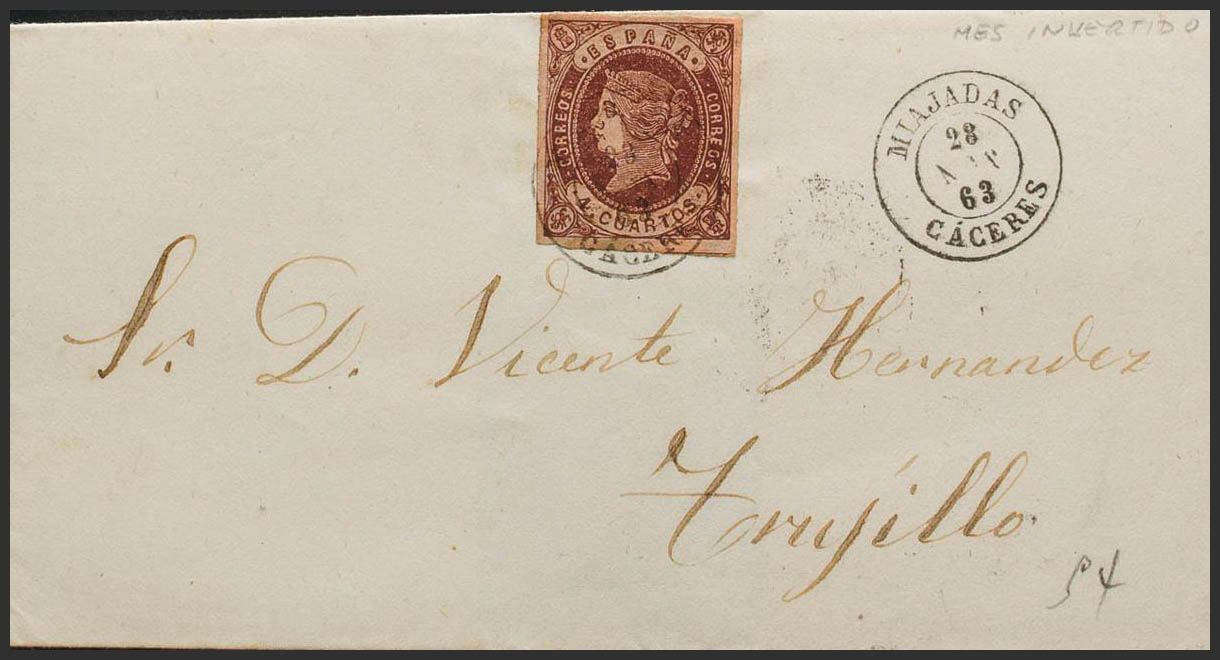 58. 1863. 4 cuartos castaño. MIAJADAS a TRUJILLO. Matasello MIAJADAS / CACERES. MAGNIFICA.
