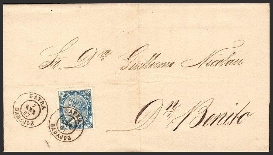 88. 1867. 4 cuartos azul. ZAFRA a DON BENITO. Matasello ZAFRA / DON BENITO. MAGNIFICA.