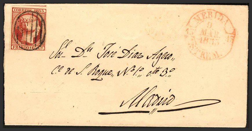 17. 1853. 6 cuartos rosa. MERIDA a MADRID. Matasello PARRILLA, al lado baeza MERIDA / ESTREM. B. MAGNIFICA.