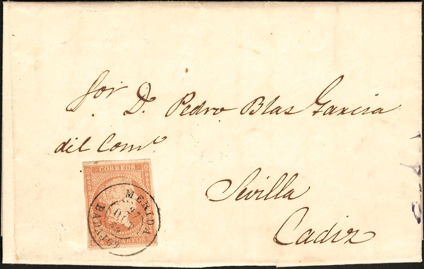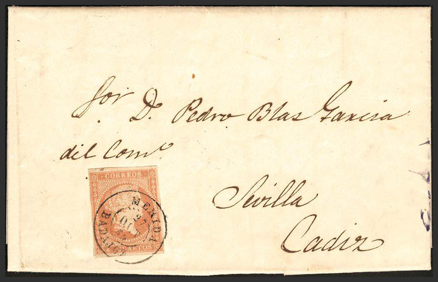 48. 1859. 4 cuartos rojo. MERIDA a CADIZ. Matasello MERIDA / BADAJOZ. MAGNIFICA.