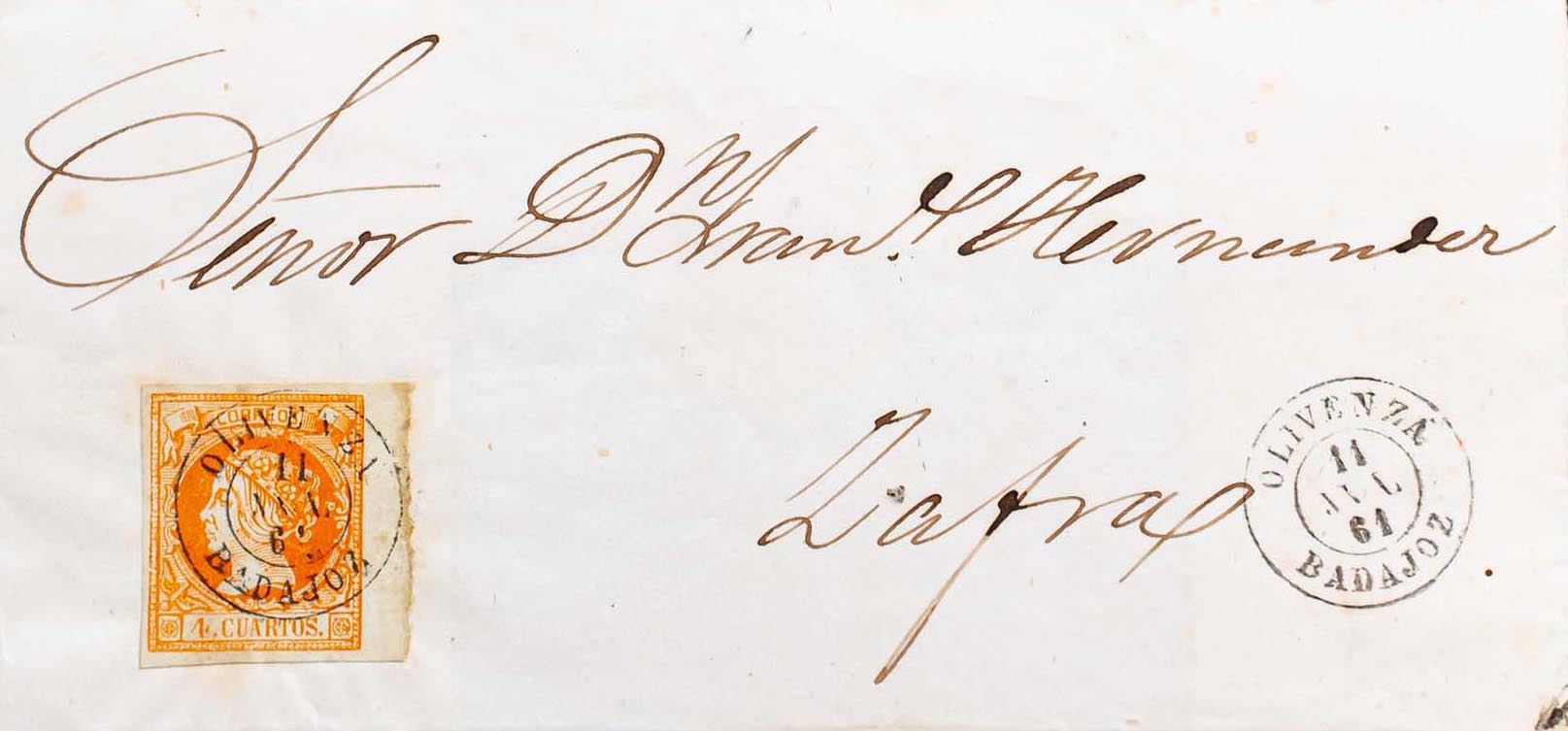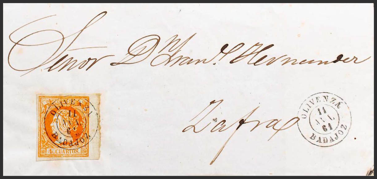 52. 1861. 4 cuartos naranja, borde de hoja. OLIVENZA a ZAFRA. Matasello OLIVENZA / BADAJOZ. MAGNIFICA E INUSUAL.