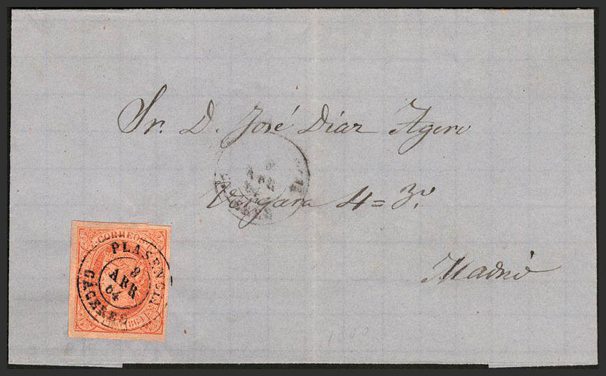64. 1864. 4 cuartos rojo. Frontal de PLASENCIA a MADRID. Matasello PLASENCIA / CACERES. MAGNIFICA.