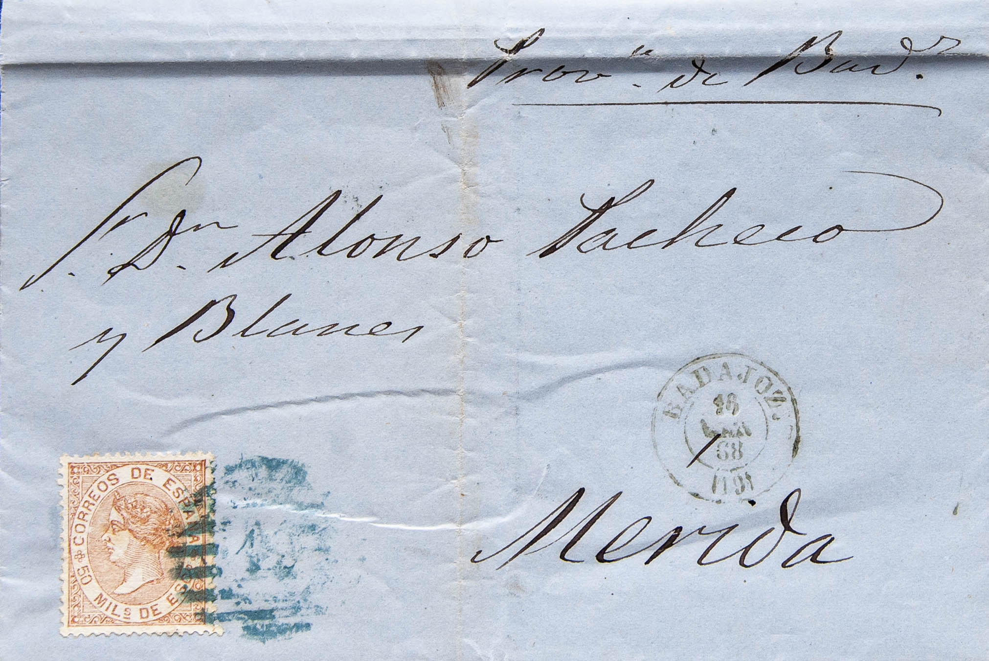 Extremadura. Historia Postal. PARRILLA CON Nª19, en azul de Badajoz. MAGNIFICA Y RARA.