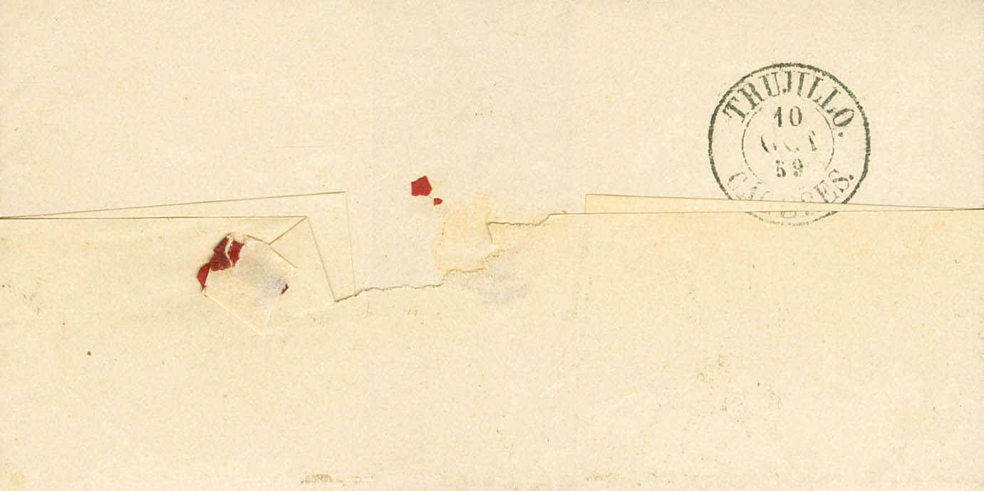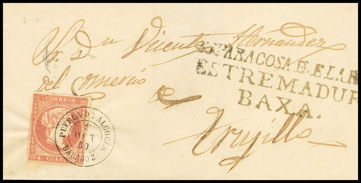 48. 1859. 4 cuartos rojo. ESPARRAGOSA DE LARES a TRUJILLO. Matasello PUEBLA DE ALCOCER / BADAJOZ y en el frente marca prefilatélica ESPARRAGOSA DE LARES / ESTREMADURA BAXA, en negro. MAGNIFICA Y MUY RARA.