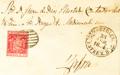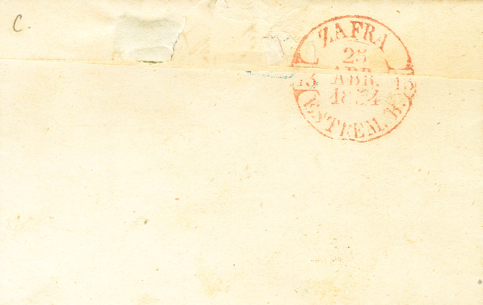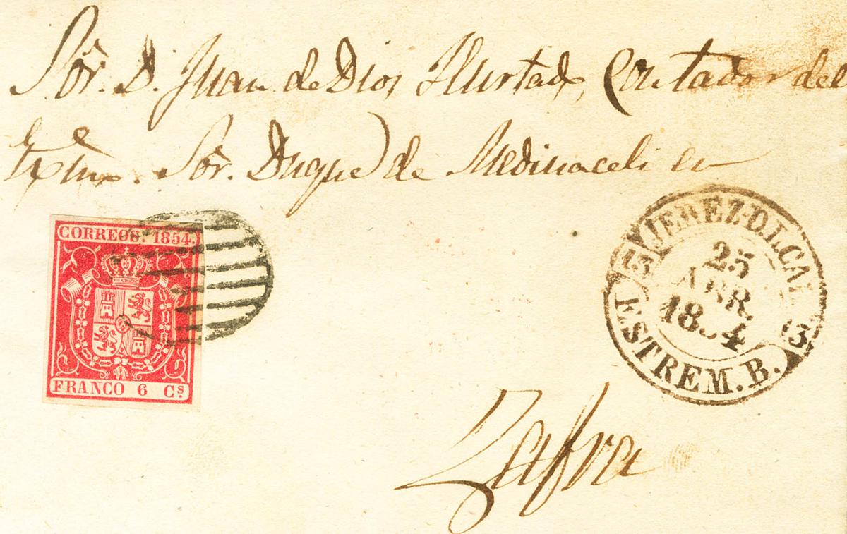 24. 1853. 6 cuartos carmÃn. JEREZ DE LOS CABALLEROS (BADAJOZ) a ZAFRA. En el frente baeza JEREZ D.L.CAB. / ESTREM.B., en rojo oxidado. MAGNIFICA.