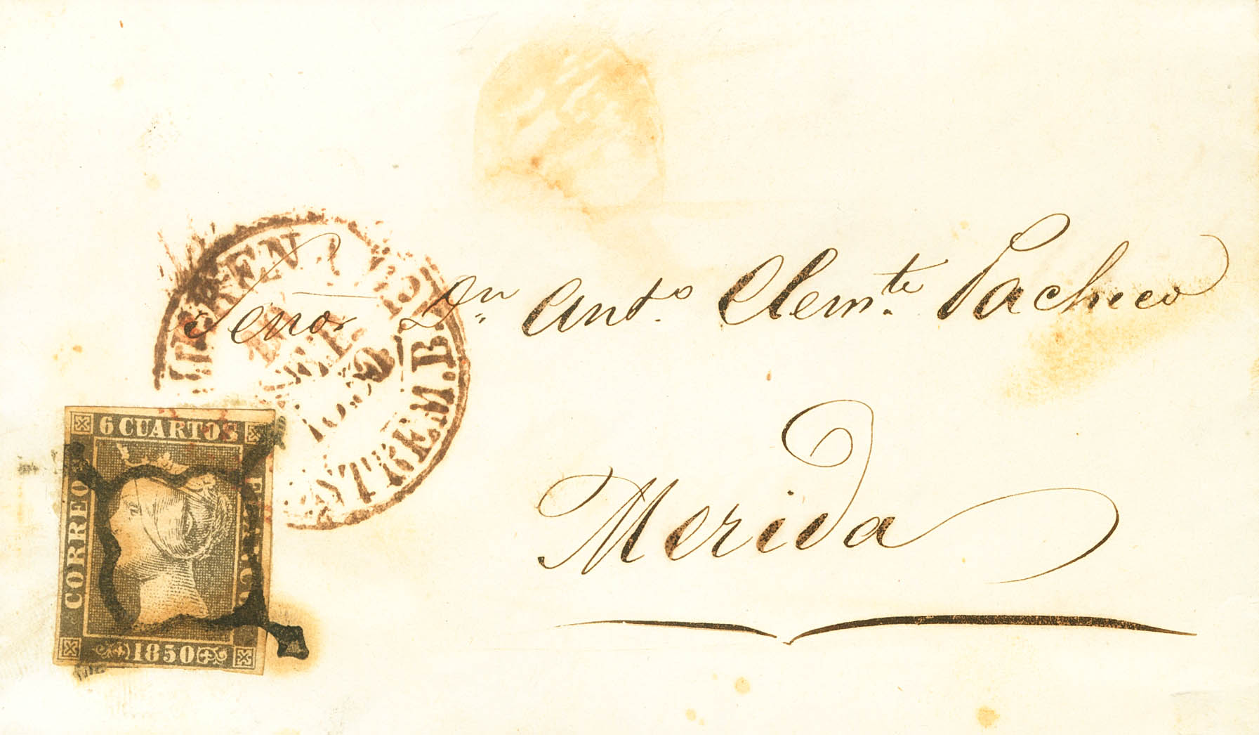 1A. 1850. 6 cuartos negro. LLERENA (BADAJOZ) a MERIDA. Matasello mixto ARAÑA y baeza LLERENA / ESTREM. B. MAGNIFICA Y RARA.