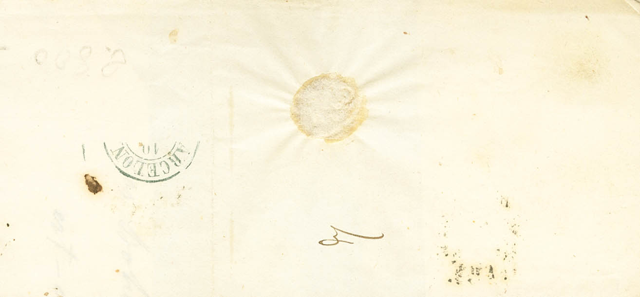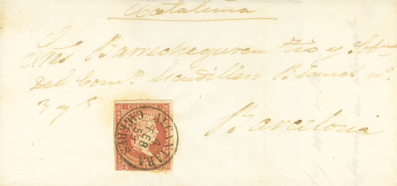 48. 1859. 4 cuartos rojo. ALCANTARA a BARCELONA. Matasello ALCANTARA / CACERES (Tipo I). MAGNIFICA Y RARA, ESPECIALMENTE CON ESTA ESPECTACULAR ESTAMPACION.