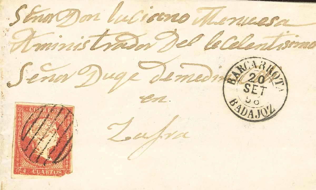 44. 1858. 4 cuartos rojo (esquina corta). En el frente fechador BARCARROTA / BADAJOZ (Tipo I). BONITA.