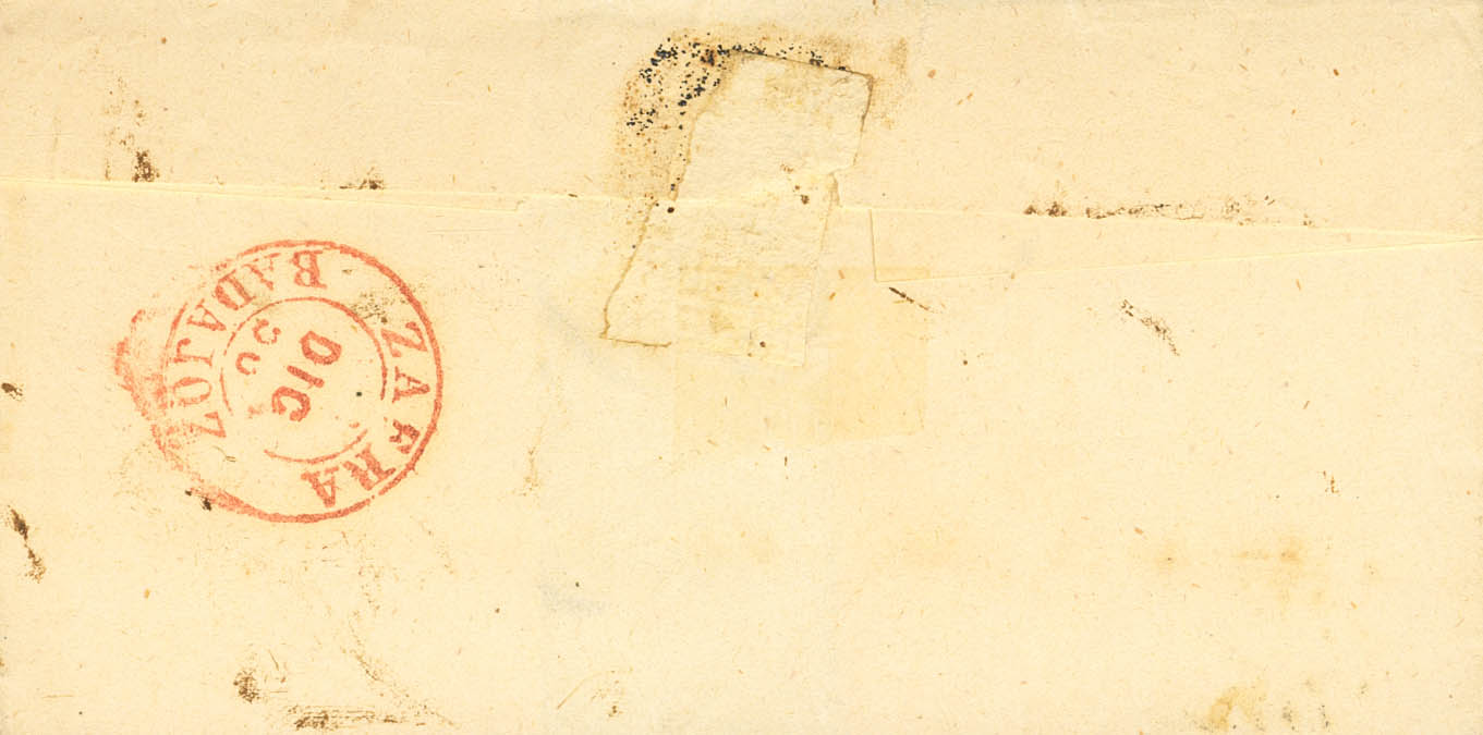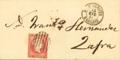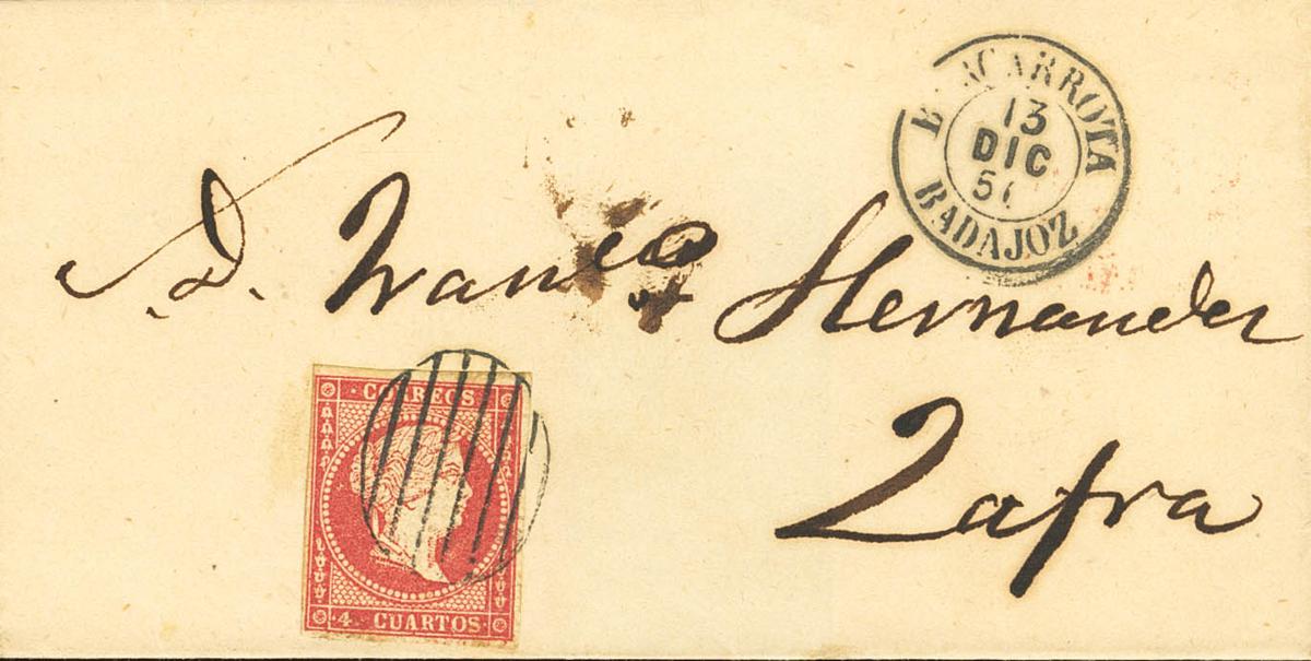 44. 1856. 4 cuartos rojo. BARCARROTA a ZAFRA. En el frente fechador BARCARROTA / BADAJOZ (Tipo I). MAGNIFICA.