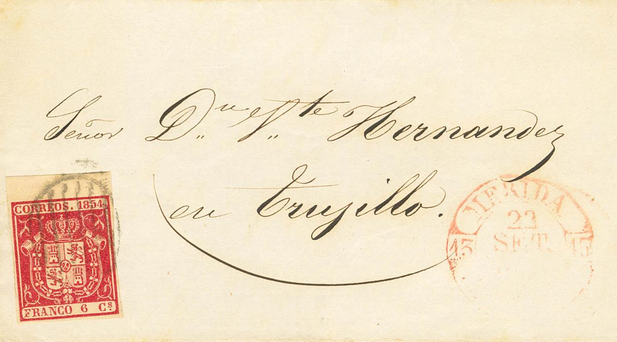 24. 1854. 6 cuartos carmÃn, borde de hoja. Frontal de MERIDA a TRUJILLO. En el frente baeza MERIDA / ESTREM.B. BONITA.