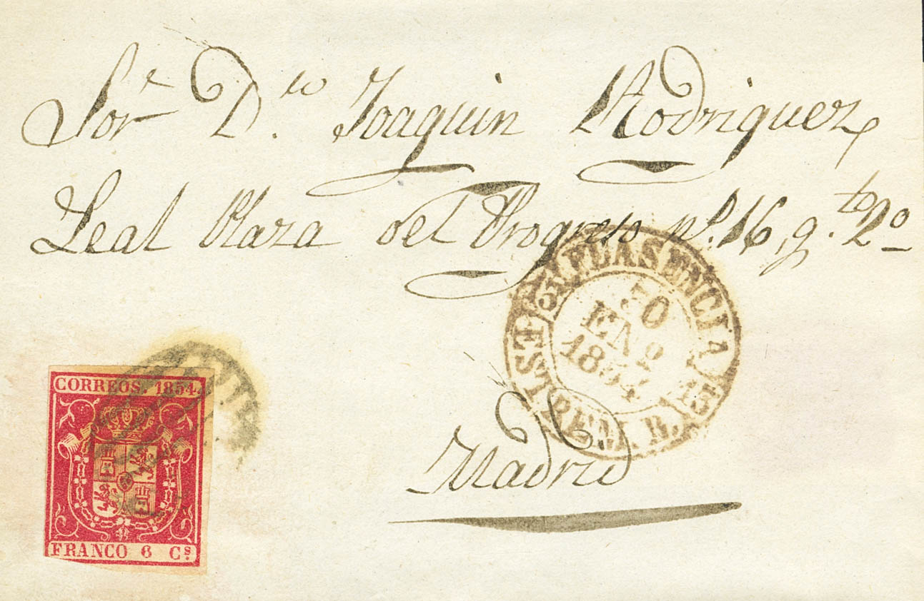 27. 1854. 6 cuartos carmÃn (margen justo). PLASENCIA a MADRID. En el frente baeza PLASENCIA / ESTREM.B. MAGNIFICA.
