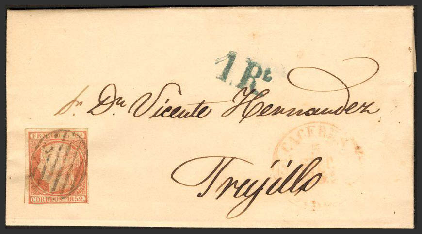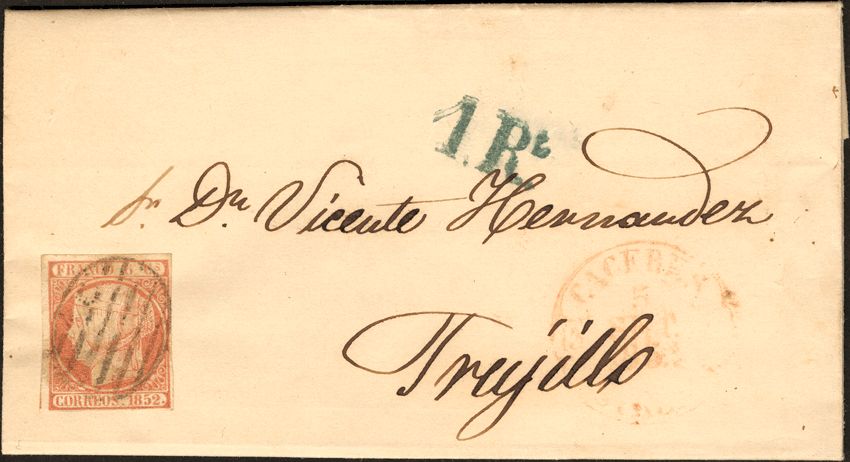 12. 1852. 6 cuartos rosa. CACERES a TRUJILLO. Tasada "1 RL", en azul. MAGNIFICA Y RARA.