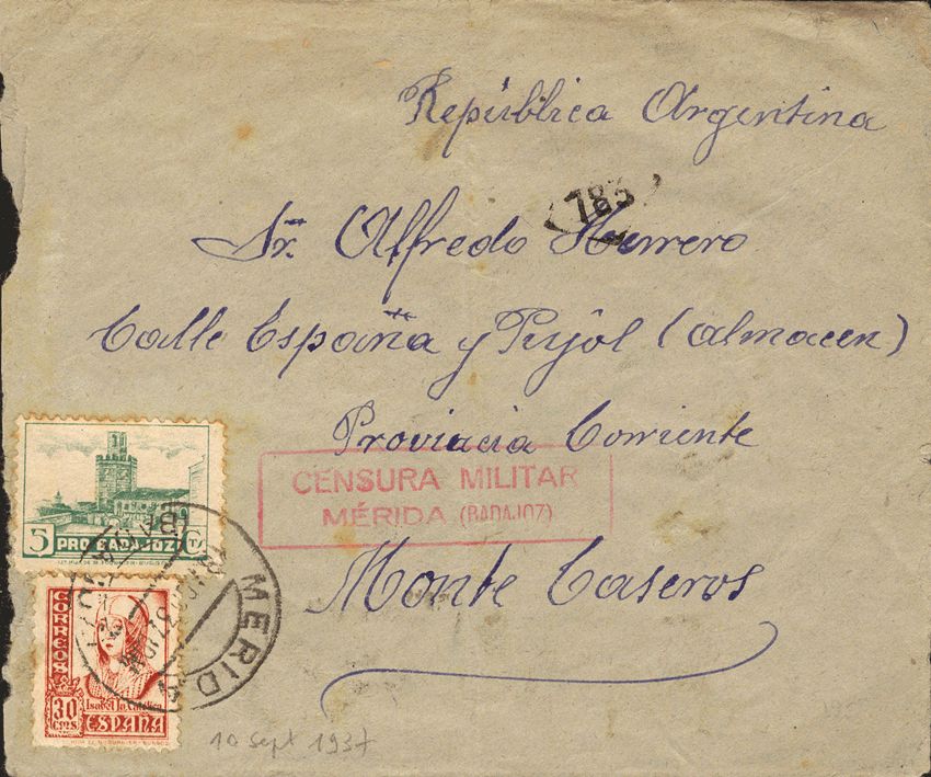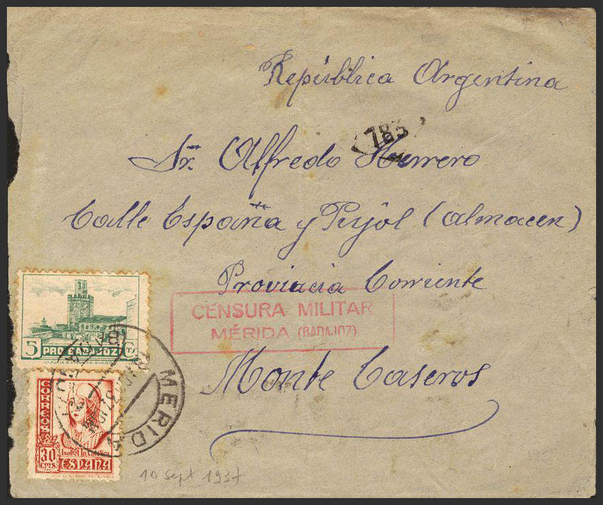 Extremadura. Historia Postal. CENSURA MILITAR / MERIDA (BADAJOZ). Al dorso llegada. MAGNIFICA.