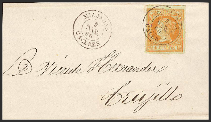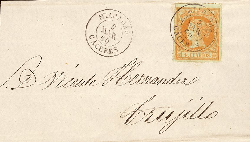 Extremadura. Historia Postal. Frontal. Matasello MIAJADAS / CACERES. MAGNIFICO.