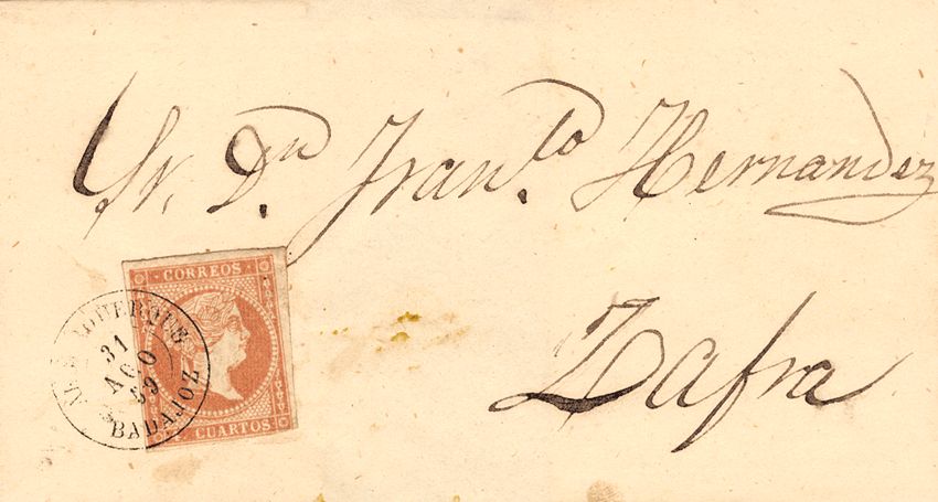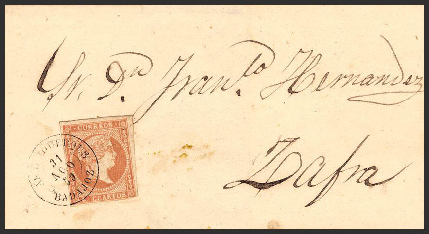 48. 1859. 4 cuartos rojo. ALBURQUERQUE a ZAFRA. Matasello ALBURQUERQUE / BADAJOZ. MAGNIFICA.